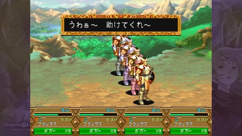 Part of Tower of Doom’s charm obviously had to do with legendary character designer Kinu Nishimura working on its art direction, which feels more balanced in the mix between its Western inspiration and Japanese realization compared with its sequel, Shadow over Mystara, which had a more marked Eastern feel conveyed by subtle details such as hair stylings, facial expressions and some key animations and reminded me of Lodoss Wars, itself a Japanese series heavily inspired by D&D and Western sword and sorcery.