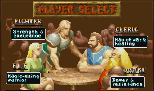 Like most D&D adventure modules of the time, Tower of Doom starts in a tavern, where up to four players (which, given how cramped the joystick real eastate of this cabinet was, likely only worked for us children) could choose their favorite adventurer, either a Fighter, Cleric, Dwarf or lady Elf, before starting the quest. Before lamenting a poor adaptation of TSR’s rule set, it’s useful to remember that in D&D’s Basic Edition Dwarves and Elves were indeed classes, not races, contrary to what happened in Advanced D&D, which already featured multiclassing options for non-human races and convoluted, one-time dual classing for humans, as shown in the videogame space by titles such as SSI’s legendary Gold Box games and, later, by Infinity Engine-era WRPGs.